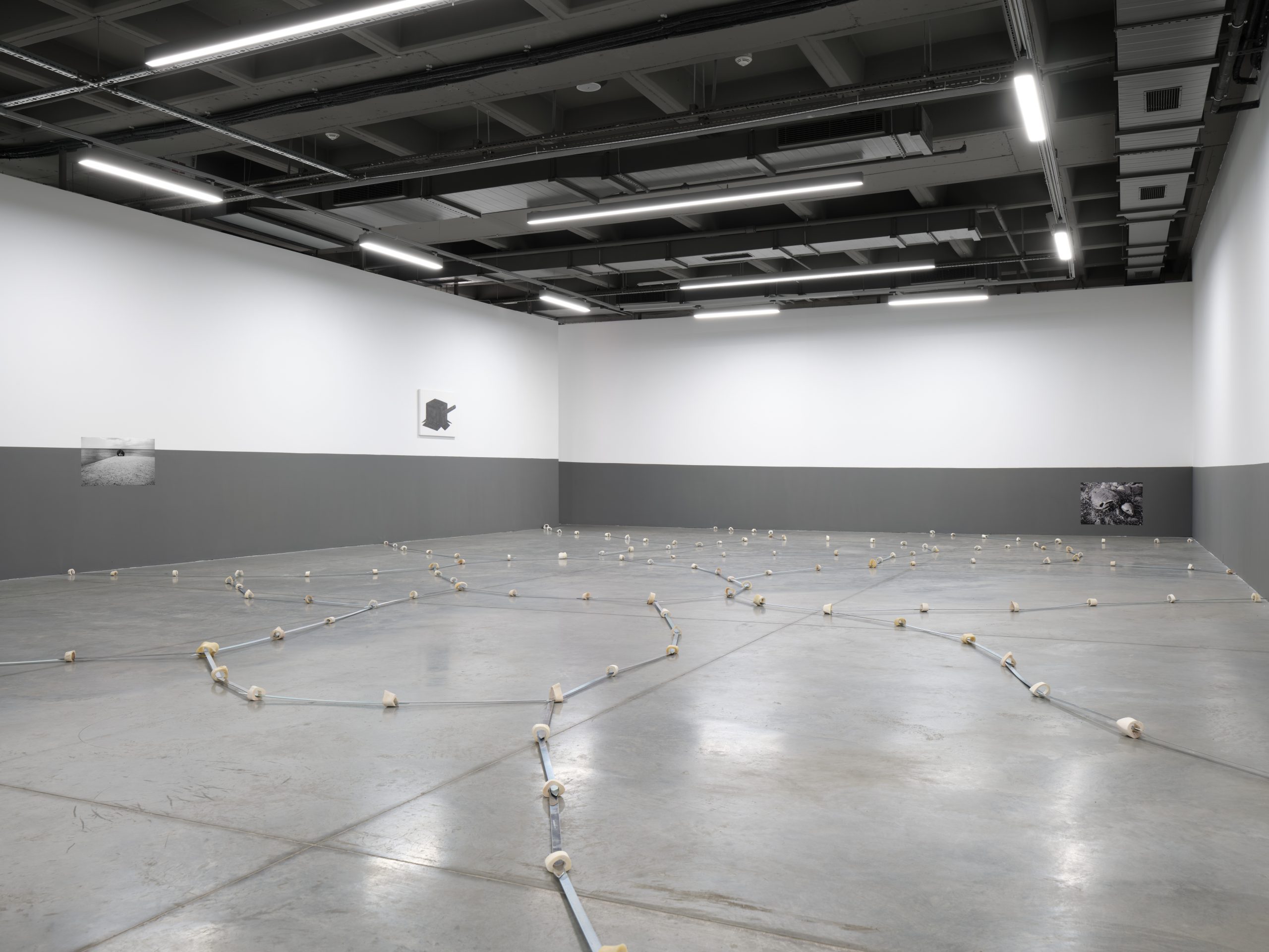 its title, presents the gallery’s broad, isolated walls painted to resemble government offices, though marked by a subtle “imbalance.” Parcel / Marcel, spreading across the gallery floor, is a new and more extensive iteration of a work Birsel previously exhibited in 2017 in the group show Tu m’arcel at Ariel Sanat. In Birsel’s work, this installation, using skewers and shank bones —objects he has employed before— demonstrates an impactful criticality, functioning simultaneously as architectural, musical, and poetic elements.